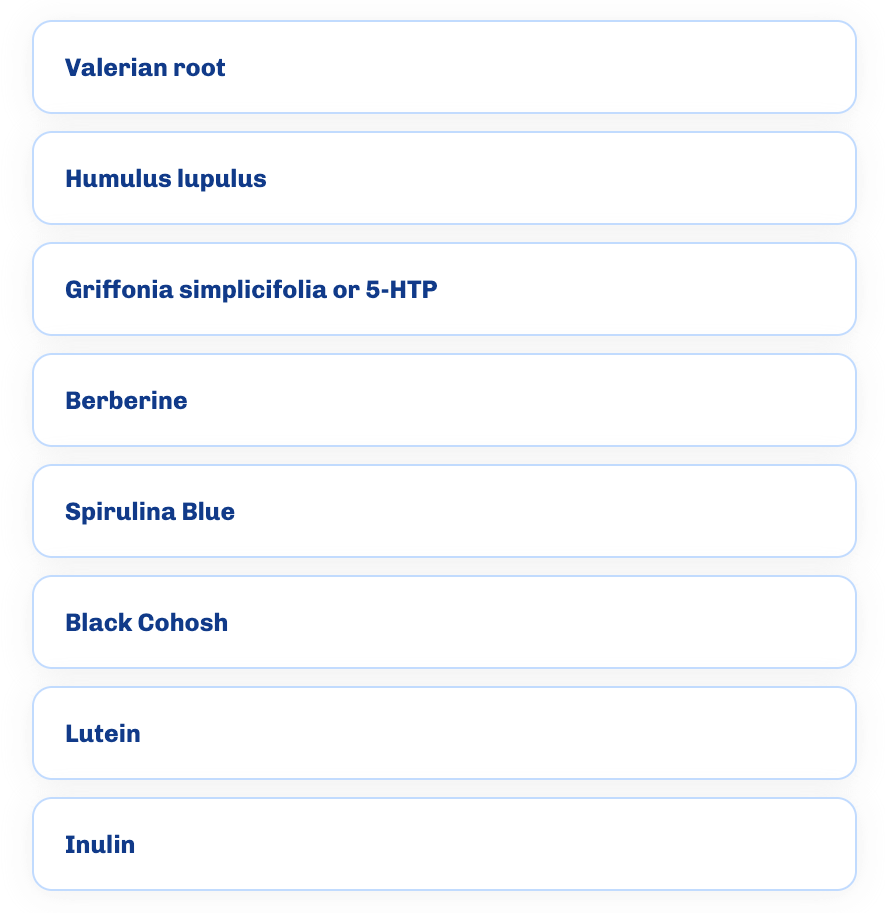 Per the official sales page, the formula lists eight natural actives: Valerian Root, Humulus Lupulus (Hops), Griffonia simplicifolia (5-HTP), Berberine, Spirulina Blue, Black Cohosh, Lutein, and Inulin.